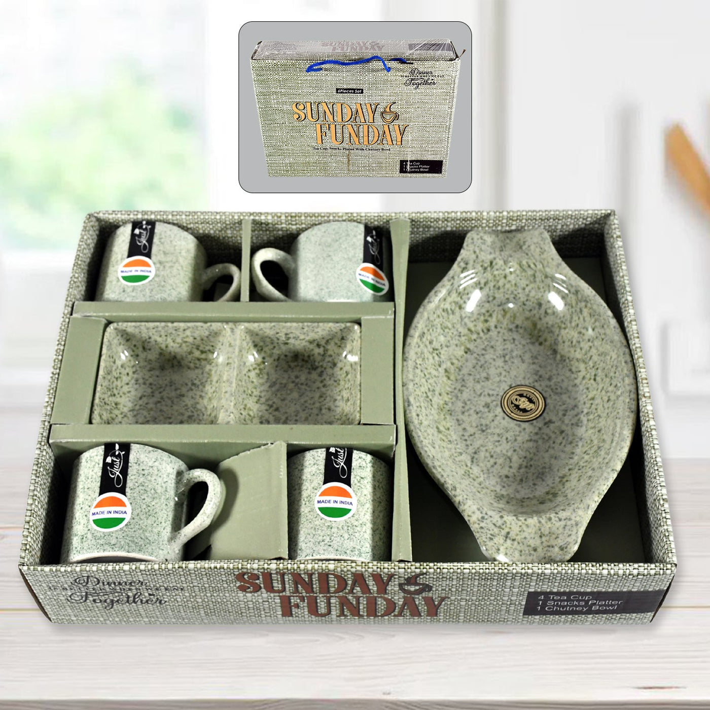 8240 Sunday Funday Ceramic Tea / cups / Mug With Plastic Snacks Platter and 2 compartment Chutney Bowl Milk Cup, Coffee Cup, Breakfast Cup, Drinking Mug or Outdoor for Household, Gift for Birthday, Wedding Party (6 Pcs set)Description :-4 pcs Ceramic cup & 2 Compartment 1Pc Plastic Chutney bowl and 1 Pc Snacks Platter 6-piece set of bowls, platter, and cups. Made from a durable ceramic cup, plastic bowl and Platter, these stunning pieces are the perfect addition to your collection. Serve up your favorite snacks and drinks in style and impress your guests with their unique design.